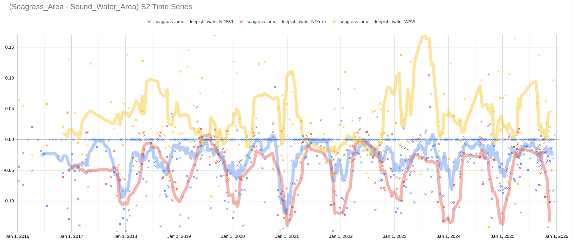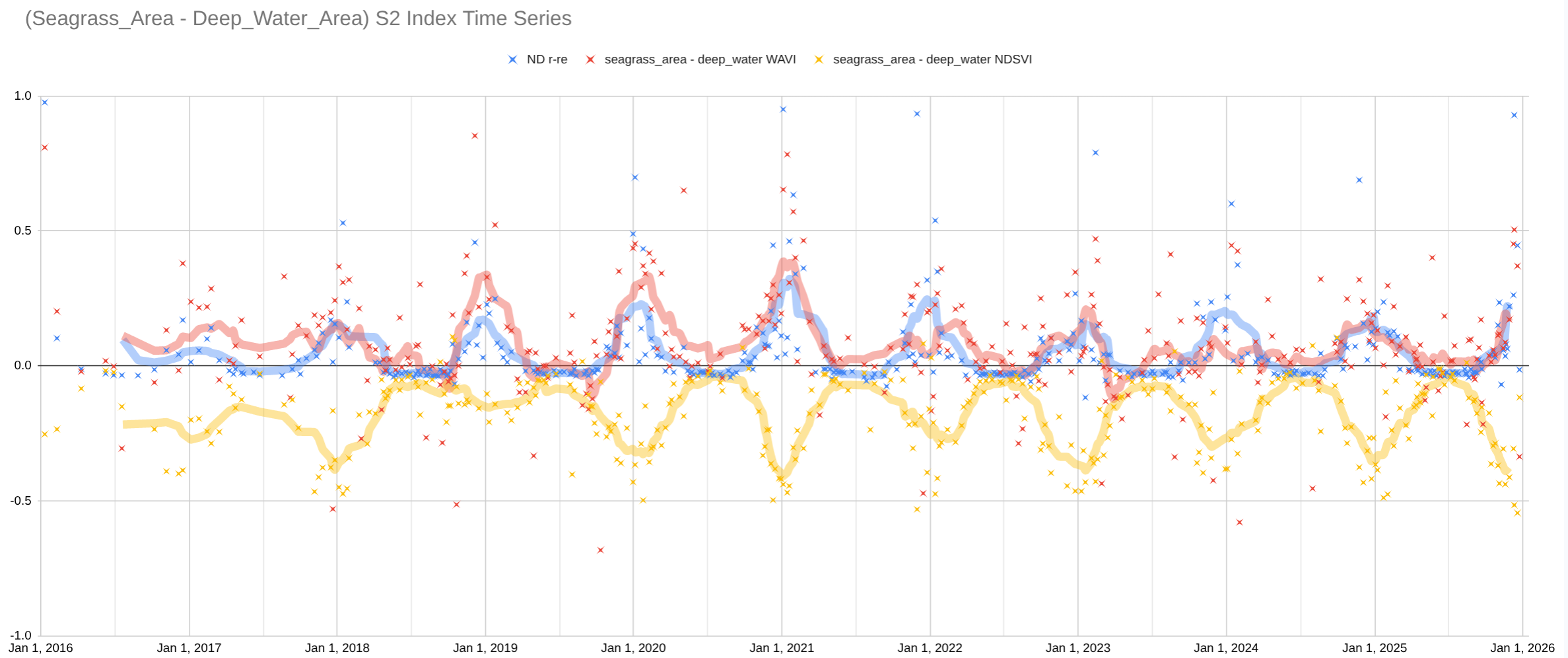 The NDSVI and ND_R_RE signals covary closely. The WAVI signal shows weaker seasonality and an apparent event in winter of 2022. These differences may indicate different kinds of water quality or seagrass phenology events (turbidity vs algae blooms vs seagrass die-off).