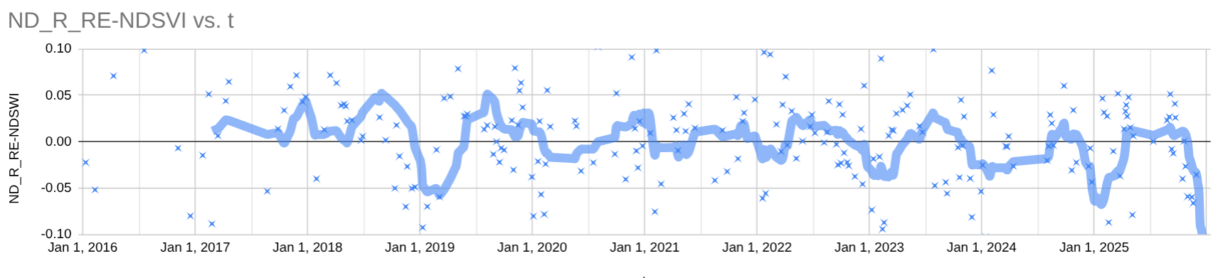 The ND_R_RE-NDSVI signal shows an event in the spring of 2019, immediately following hurricane Michael. Another similar event is observed in spring of 2025. A seasonal cycle between spring and fall is observed in most years.
