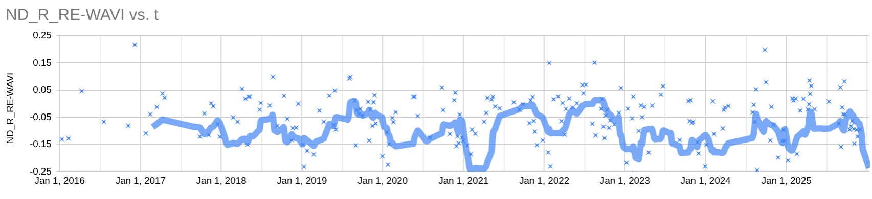 By subtracting one index from the other, we can get a sense of how spectral indices are changing over time relative to one another. The sound-water-corrected WAVI and NDSWI are each subtracted from the ND_R_RE signal.