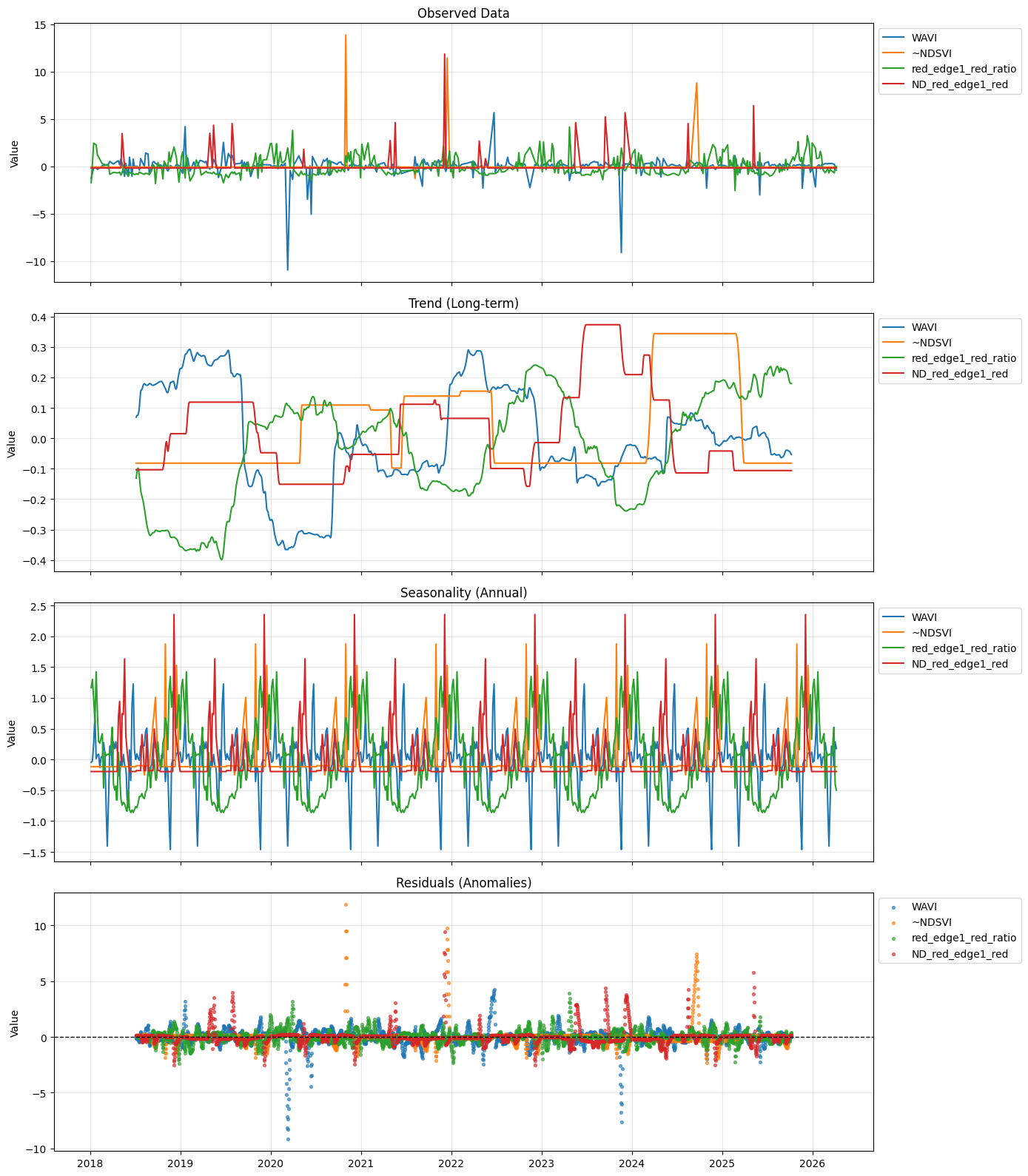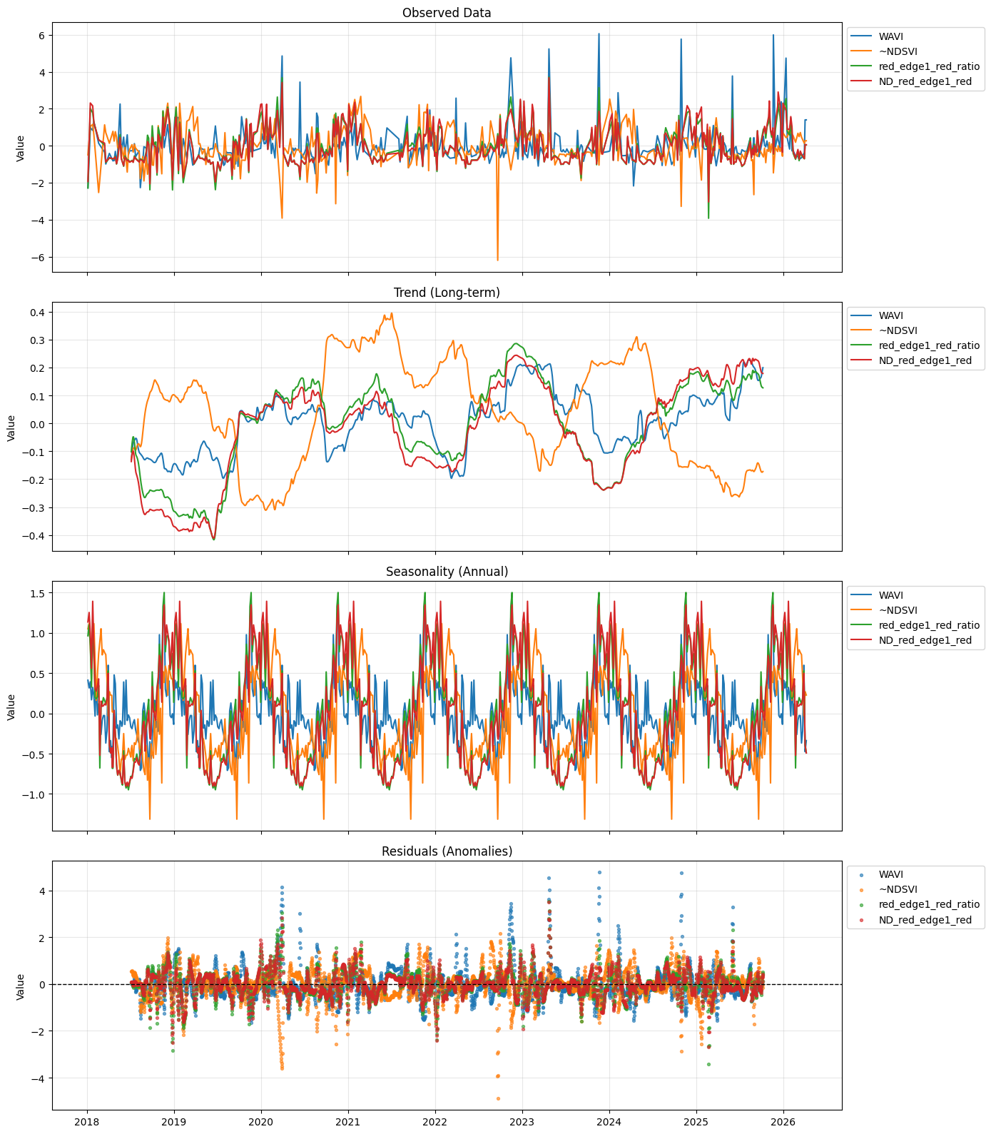 A sine-shaped seasonal signal is observed in each of the indices. Long-term trends for WAVI, red_edge1_red_ratio, and ND_red_edge1_red follow each other closely.